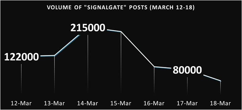 Interest in "Signalgate" on X has started to dissipate, according to a bourgeois.news analysis of social media traffic. Discussion around the leaked Signal discussion of the U.S. attack on Yemen peaked at 10:00 a.m. ET on March 26 and has been in a steady decline since then; as of March 30, more 1.2 million posts have been made to X about the embarrassing snafu.